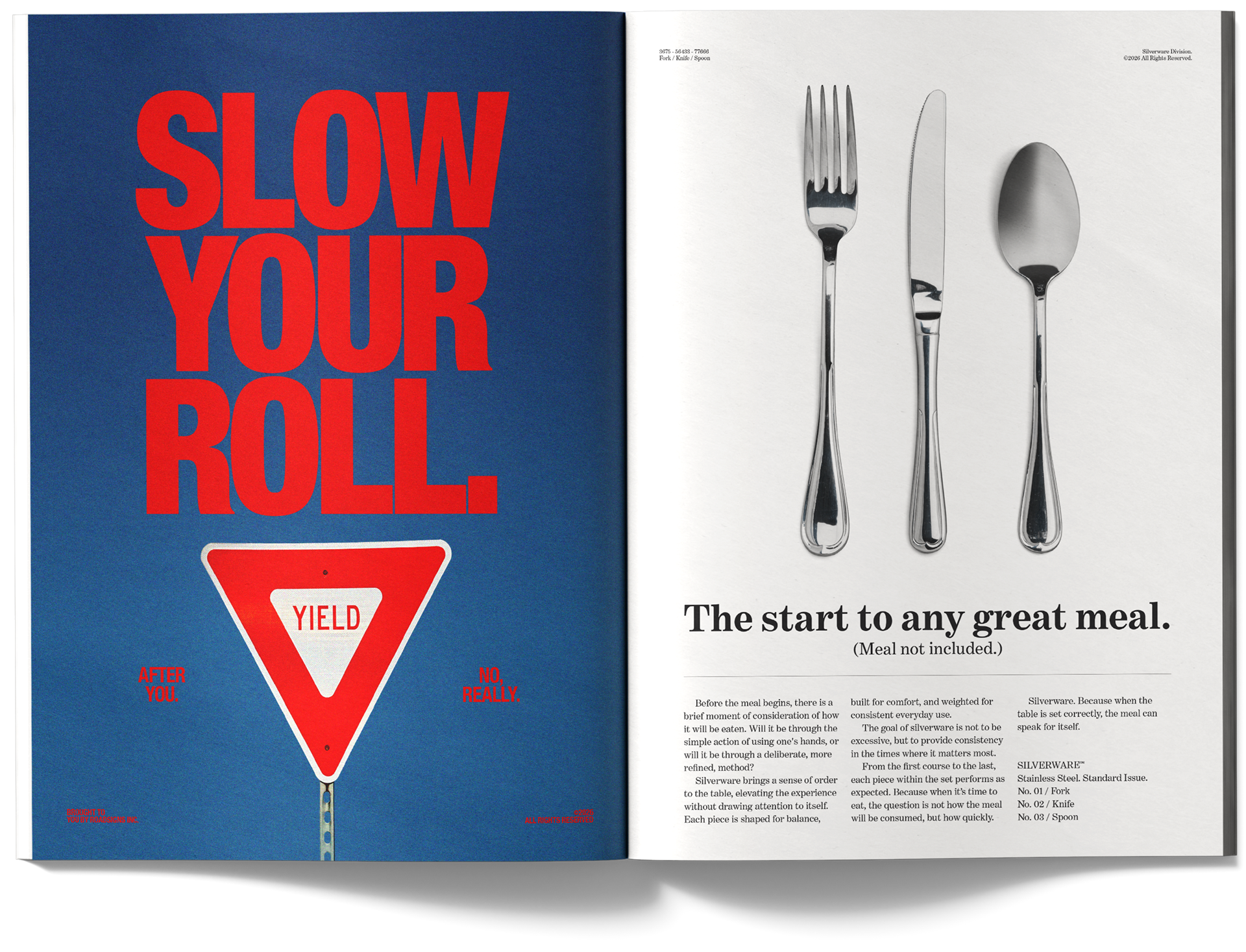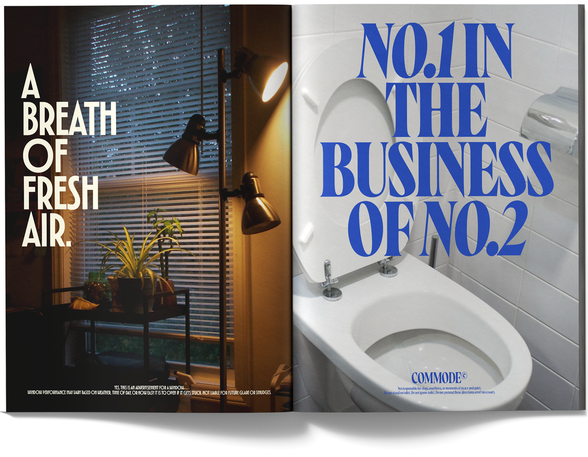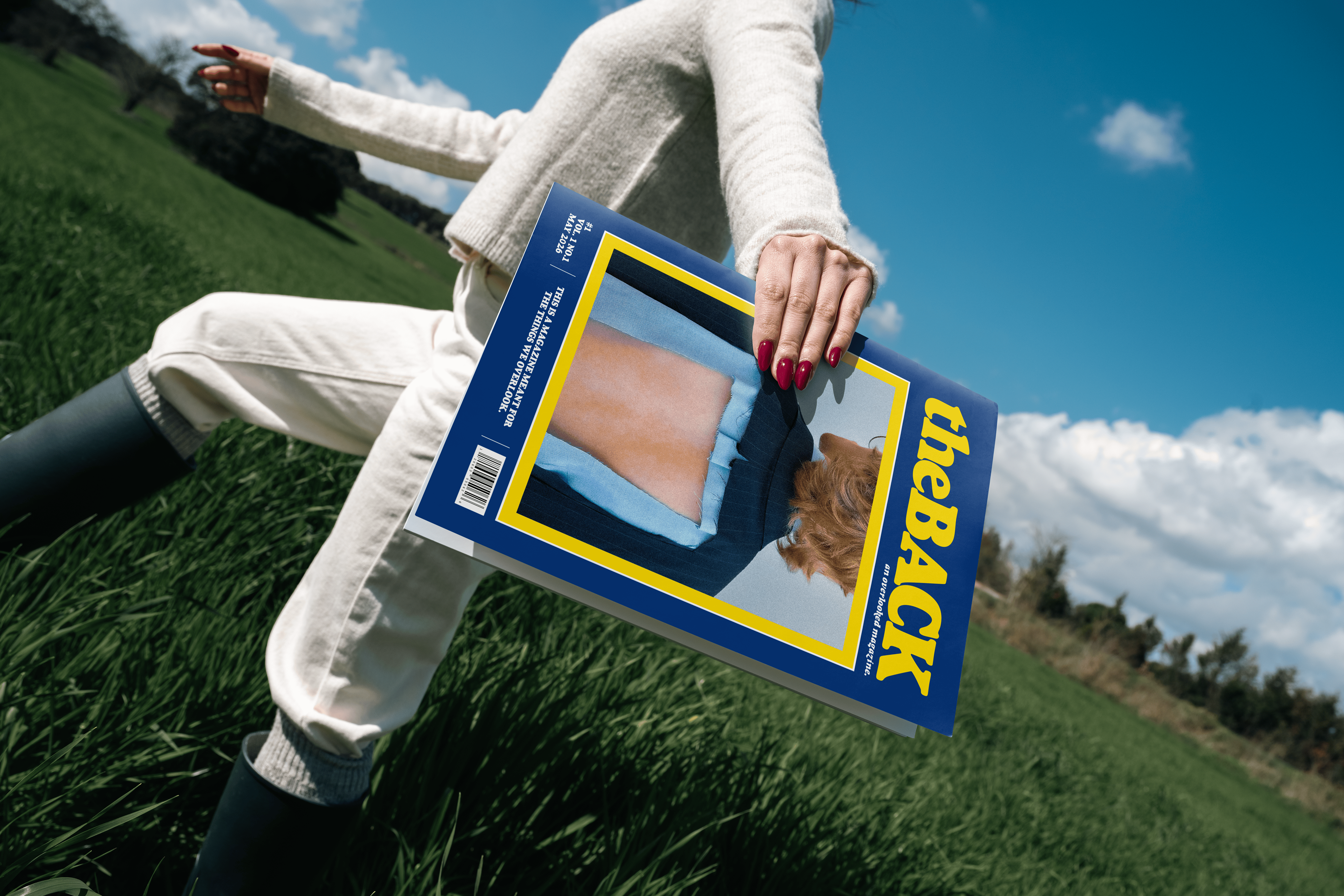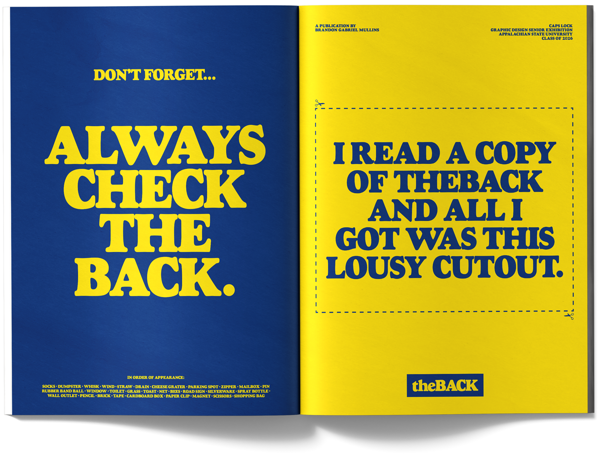 theBACK is a satirical magazine publication that offers witty critiques of consumer culture by appropriating the visual language and techniques of advertising itself. The entire publication consists solely of advertisements for “products” that intentionally fall under the category of the mundane, overlooked, absurd, or unmarketable. Inspired by the visual language of 1980s editorial advertising by using bold layouts, vibrant photography, and pun-based headlines, theBACK uses nostalgia, advertising, and design tropes as tools for critique. By doing this, it provides critical commentary on contemporary consumerism with a satirical tone reminiscent of MAD Magazine.